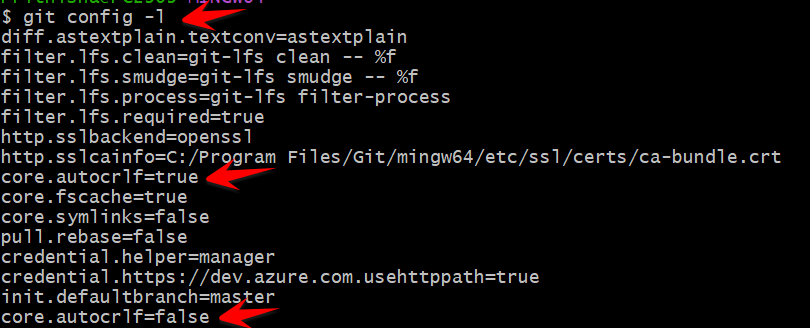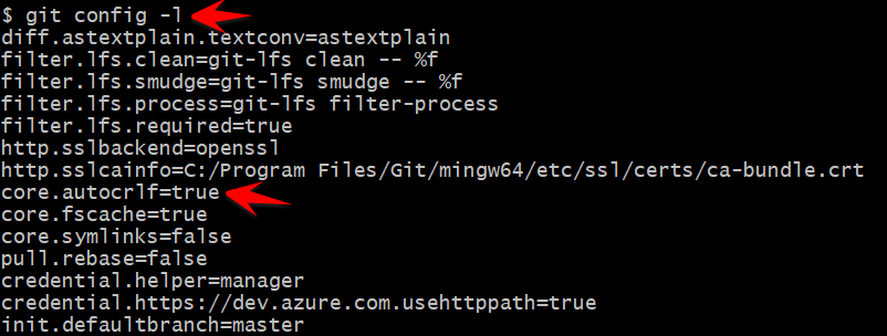 This will list all Git configurations, including the core.autocrlf setting, which controls how Git handles line endings. You might see something like this:
