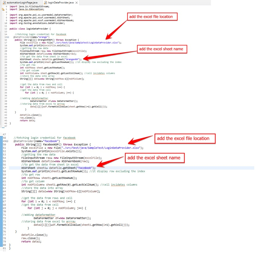 Step 5: In the Java class file "loginDataProvider". The data is being retrieved from an Excel sheet, stored, and returned to a two-dimensional string array with a @Dataprovider(name="") annotation.